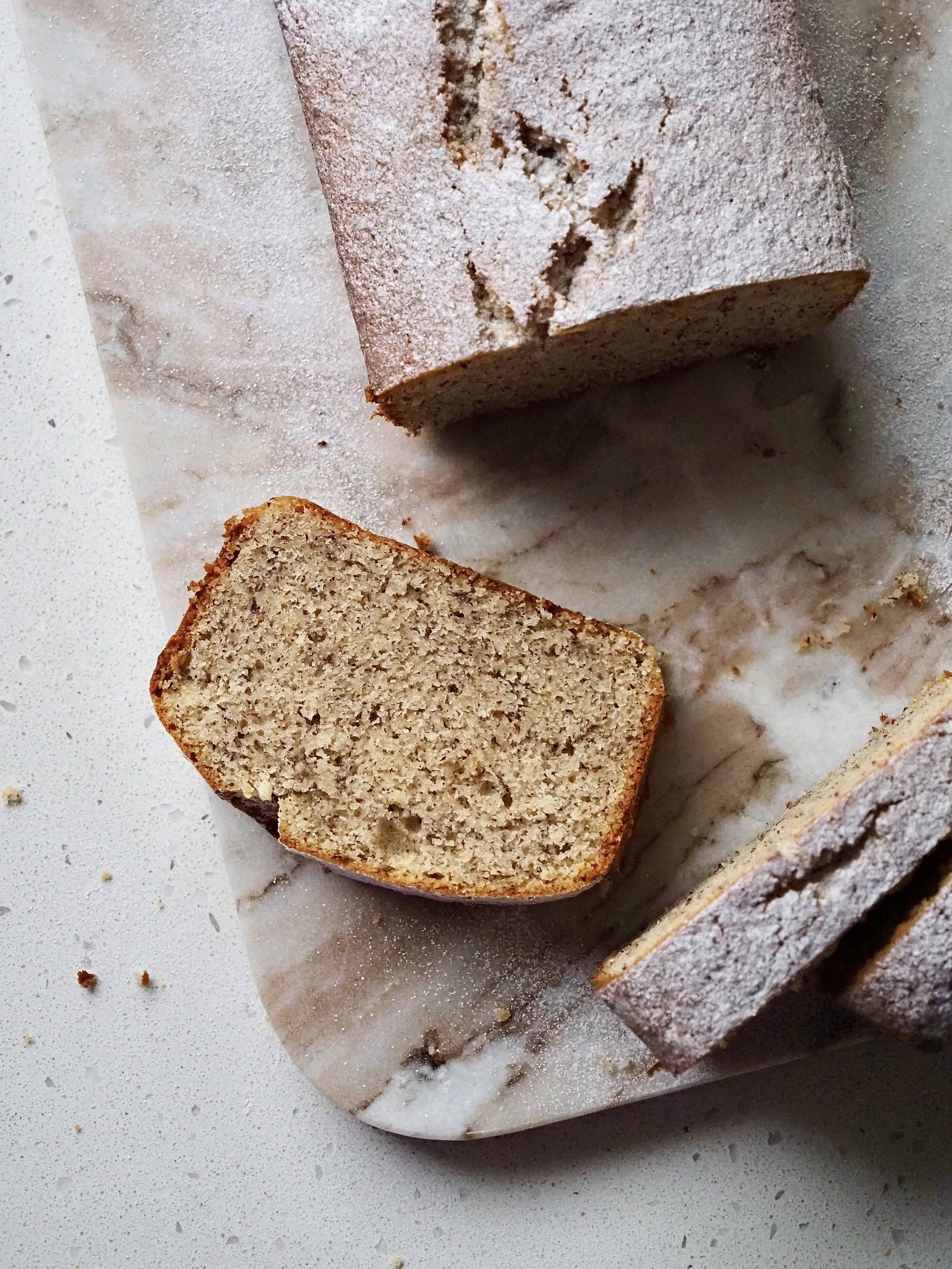 Alternativ kann der Nusskuchen auch einfach mit Puderzucker bestäubt serviert werden (wie hier abgebildet).